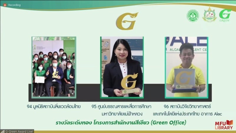 ศูนย์บรรณสารและสื่อการศึกษา มฟล. ได้รับรางวัลสำนักงานสีเขียว (Green Office) ระดับดีเยี่ยม ของกรมส่งเสริมคุณภาพสิ่งแวดล้อม กระทรวงทรัพยากรธรรมชาติและสิ่งแวดล้อม โดยเป็นการรับมอบรางวัลเสมือนจริงผ่านระบบออนไลน์ โดยมีนายจตุพร บุรุษพิพัฒน์ ปลัดกระทรวงทรัพยากรธรรมชาติและสิ่งแวดล้อม กล่าวสารแสดงความยินดีและร่วมมอบรางวัลให้แก่หน่วยงานที่ได้รับรางวัลในระดับต่าง ๆ