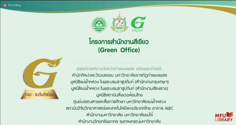 เมื่อวันที่ 16 สิงหาคม 2564 คุณดาวนภา สุยะนนท์ ผู้อำนวยการศูนย์บรรณสารและสื่อการศึกษา มหาวิทยาลัยแม่ฟ้าหลวง (มฟล.) เข้าร่วมการประกาศรางวัลสำนักงานสีเขียว (Green Office) ผ่านโปรแกรมออนไลน์ โดย มฟล. ได้รับรางวับระดับดีเยี่ยม