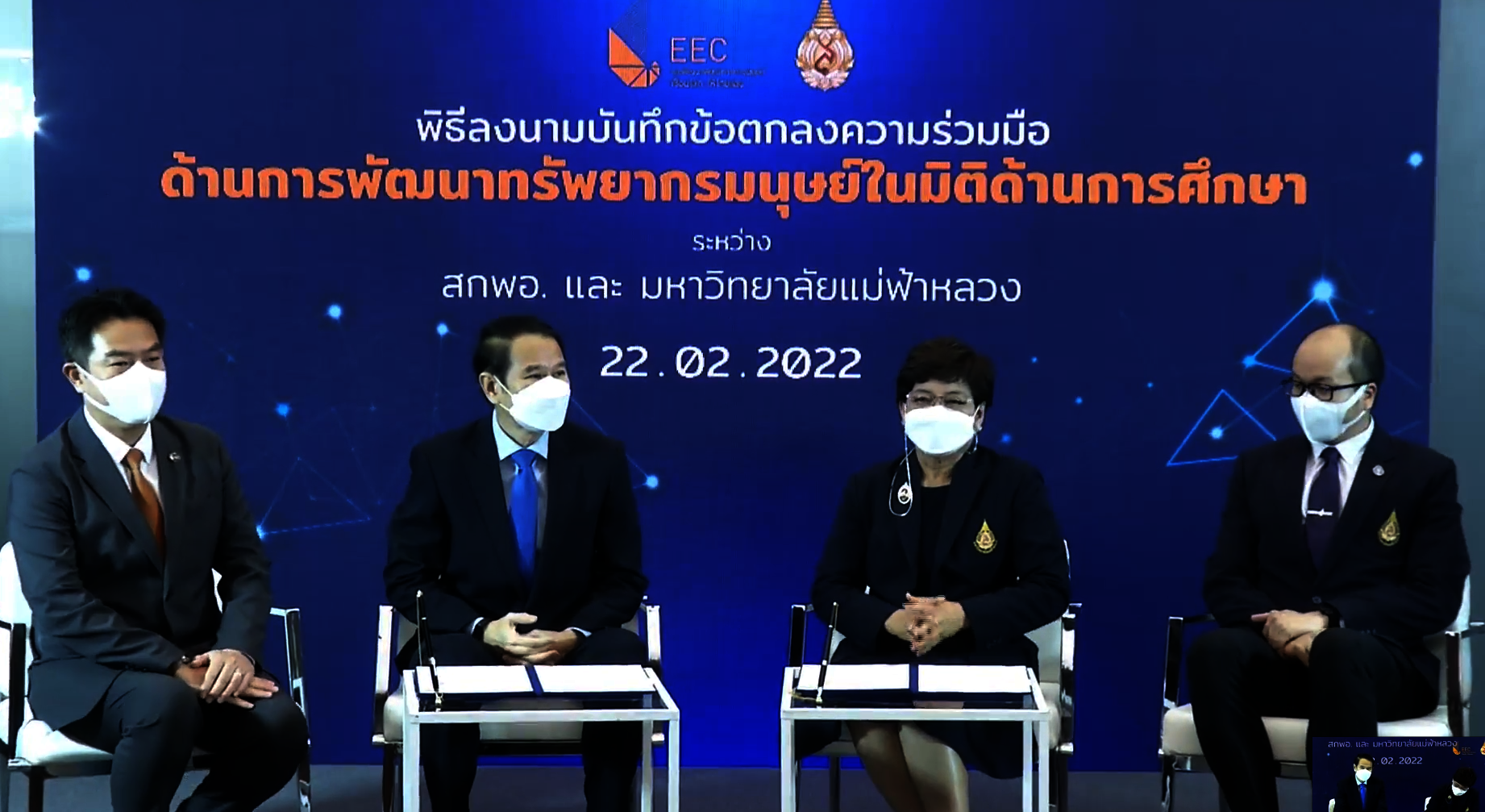 เมื่อวันที่ 22 กุมภาพันธ์ 2565 รองศาสตราจารย์ ดร.ชยาพร วัฒนศิริ อธิการบดีมหาวิทยาลัยแม่ฟ้าหลวง (มฟล.) และ ดร.คณิศ แสงสุพรรณ เลขาธิการ สำนักงานคณะกรรมการนโยบายเขตพัฒนาพิเศษภาคตะวันออก (สกพอ.) ร่วมพิธีลงนามบันทึกข้อตกลงความร่วมมือด้านการพัฒนาทรัพยากรมนุษย์ในมิติด้านการศึกษา
