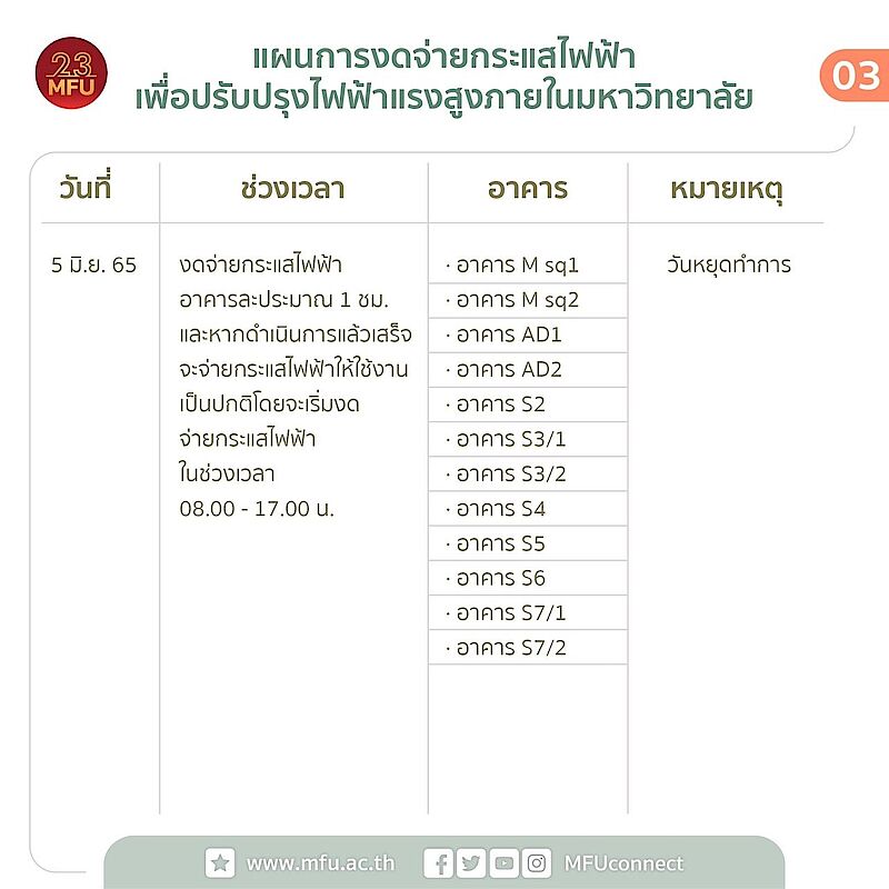 เพื่อให้การดำเนินงานเป็นไปด้วยความเรียบร้อย จึงขอแจ้งงดจ่ายกระแสไฟฟ้าตามแผนการดำเนินการฯ ดังกล่าวเพื่อความปลอดภัยของผู้ปฏิบัติงาน ซึ่งอาจส่งผลให้ไม่ได้รับความสะดวก จึงขออภัยมา ณ ที่นี้