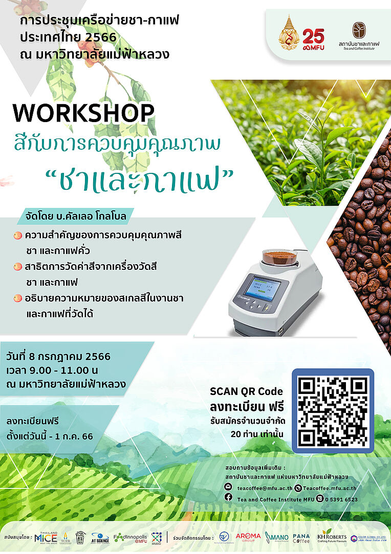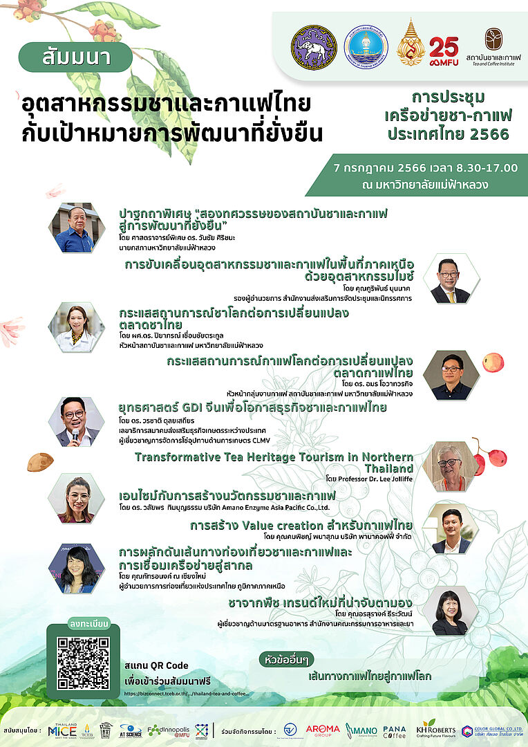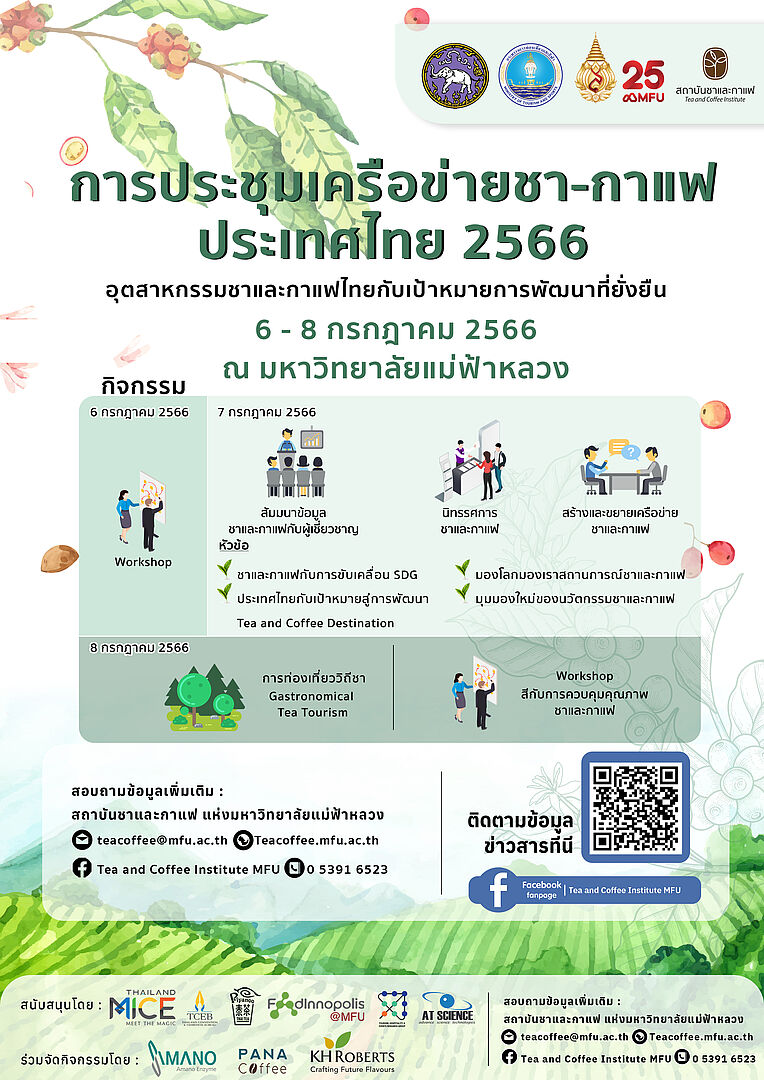 สถาบันชาและกาแฟ มหาวิทยาลัยแม่ฟ้าหลวง (มฟล.) ร่วมกับ สำนักงานส่งเสริมการจัดประชุมและนิทรรศการ (องค์การมหาชน) (สสปน.) และหน่วยงานภาคี ขอเชิญชวนเกษตรกรผู้ปลูกชา กาแฟ ผู้ประกอบการชาและกาแฟ และผู้สนใจ เข้าร่วมงาน "การประชุมเครือข่ายชา-กาแฟ ประเทศไทย 2566 : อุตสาหกรรมชาและกาแฟไทยกับเป้าหมายการพัฒนาที่ยั่งยืน" ระหว่างวันที่ 6 - 8 กรกฎาคม 2566 ณ มหาวิทยาลัยแม่ฟ้าหลวง