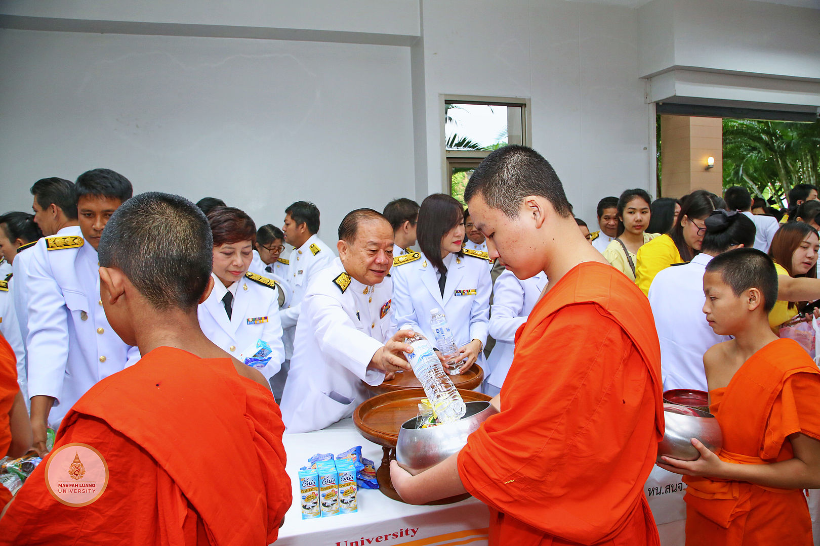 จากนั้นผู้เข้าร่วมพิธีร่วมกันทำบุญตักบาตรแด่พระสงฆ์ สามเณร จำนวน 89 รูป ก่อนที่ผู้ว่าราชการจังหวัดเชียงราย นำพสกนิกรทุกหมู่เหล่า ร่วมพิธีวางพวงมาลาเบื้องหน้าพระบรมฉายาลักษณ์ พระบาทสมเด็จพระปรมินทรมหาภูมิพลอดุลยเดช บรมนาถบพิตร เนื่องในวันคล้ายวันสวรรคต 13 ตุลาคม 2561 ที่อาคารพลเอกเภา สารสิน มฟล.