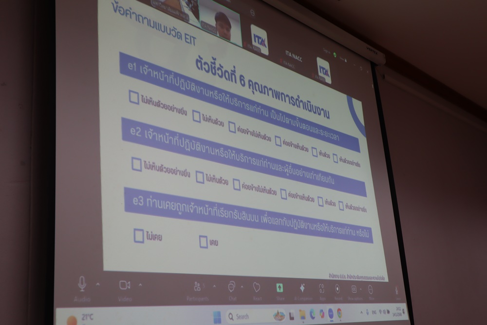 เมื่อวันที่ 14 มกราคม 2568 มหาวิทยาลัยแม่ฟ้าหลวง ได้ดำเนินการจัดเก็บข้อมูลการรับรู้ผู้มีส่วนได้ส่วนเสียภายนอก (EIT) ประจำปีงบประมาณ 2568 ประกอบด้วยนักศึกษาปัจจุบัน และผู้ประกอบการร้านค้าคู่สัญญาของมหาวิทยาลัยแม่ฟ้าหลวง ทั้งนี้ สำนักงานคณะกรรมการป้องกันและปราบปรามการทุจริตแห่งชาติ (สำนักงาน ป.ป.ช.) เป็นผู้ดำเนินการเก็บข้อมูลผ่านโปรแกรม Zoom ณ ห้องแม่สาย อาคารวันชัย ศิริชนะ สำนักงานอธิการบดี มหาวิทยาลัยแม่ฟ้าหลวง
