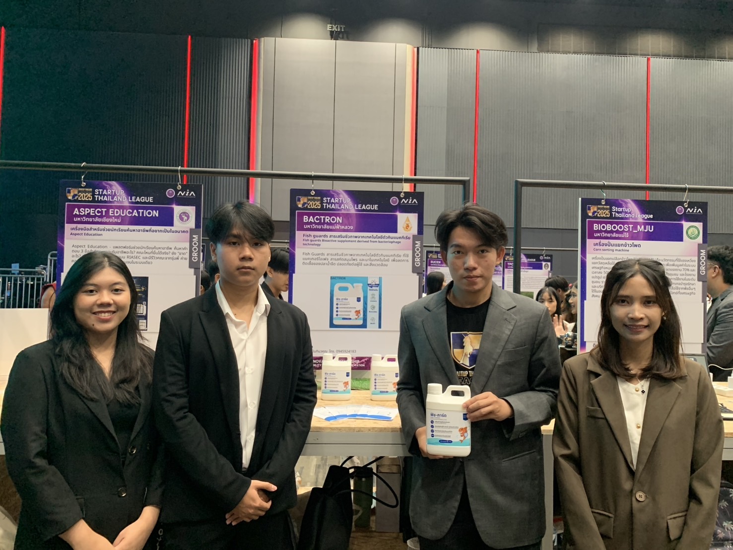 ทีม Bactron ผลิตภัณฑ์ Fish Guard สารเสริมชีวภาพจากเทคโนโลยีตัวกินแบคทีเรีย เพื่อเพิ่มภูมิคุ้มกันในสัตว์น้ำจืด ต่อยอดจากงานวิจัยของ ผศ.ดร.นันทนิจ จารุเศรณีย์ สำนักวิชาวิทยาศาสตร์ เรื่อง "การเพิ่มประสิทธิภาพเฟจเพื่อฤทธิ์กำจัดไบโอฟิล์มของเชื้อแบคทีเรีย TISTR1287"