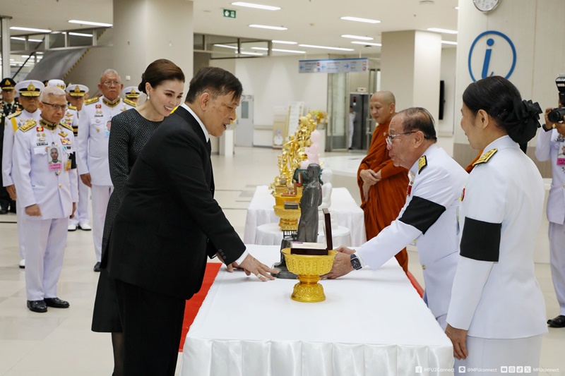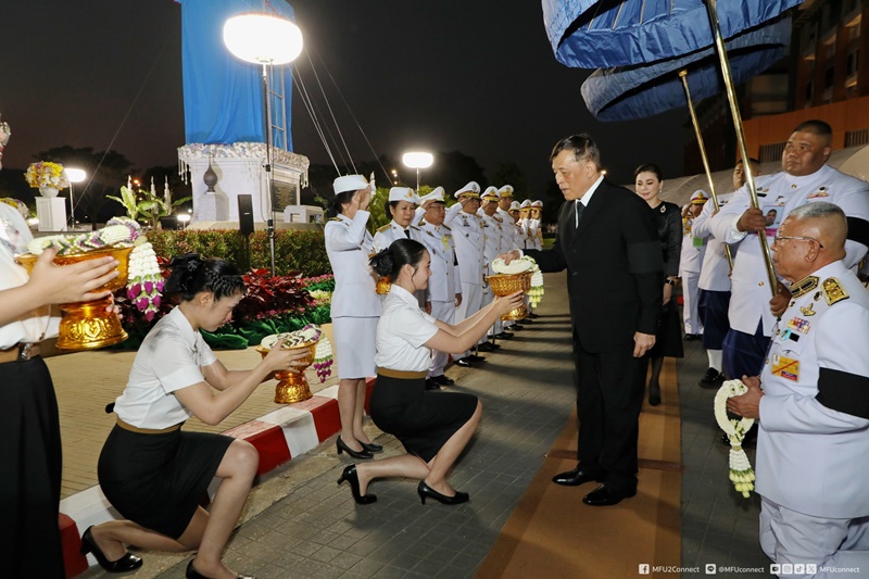 Their Majesties subsequently paid royal homage at the monument and participated in merit-making rites with members of the Sangha. On this occasion, Distinguished Professor Dr. Vanchai Sirichana presented monetary offerings for royal merit-making, while Assistant Professor Dr. Matchima Naradisorn introduced 18 benefactors of Mae Fah Luang University to receive commemorative tokens graciously bestowed by His Majesty in royal recognition.
