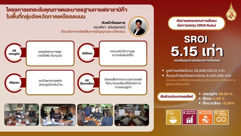 For academic service projects, the Arabica Coffee Quality and Standards Enhancement Project in Upper Northern Thailand recorded the highest return (SROI: 5.15), followed by Development of Agricultural Workforce Skills to Enhance Production and Processing in the Upper Northern Region (SROI: 1.87), and Mobile Breast and Cervical Cancer Screening Program in Remote Areas (SROI: 2.70).
