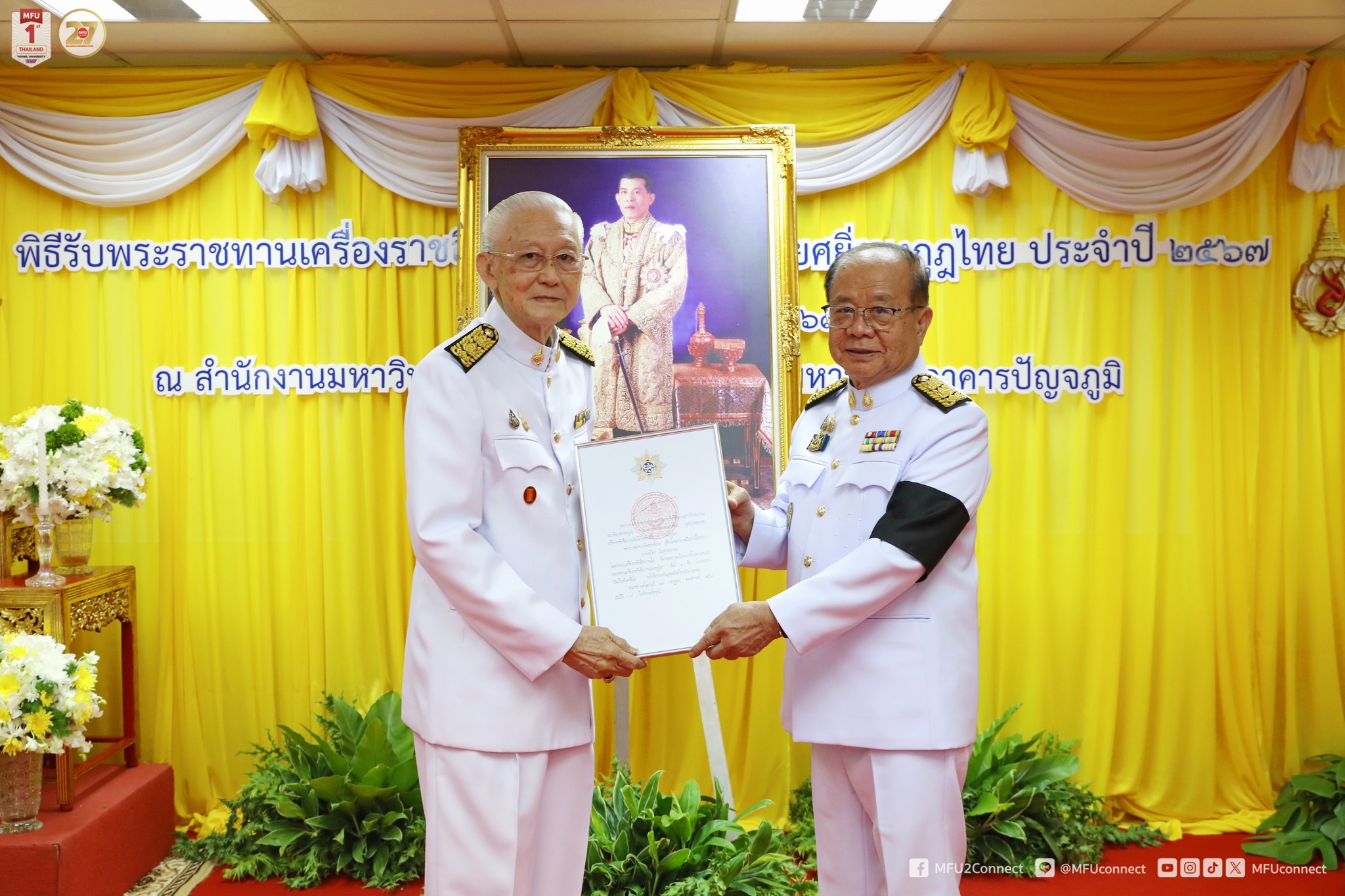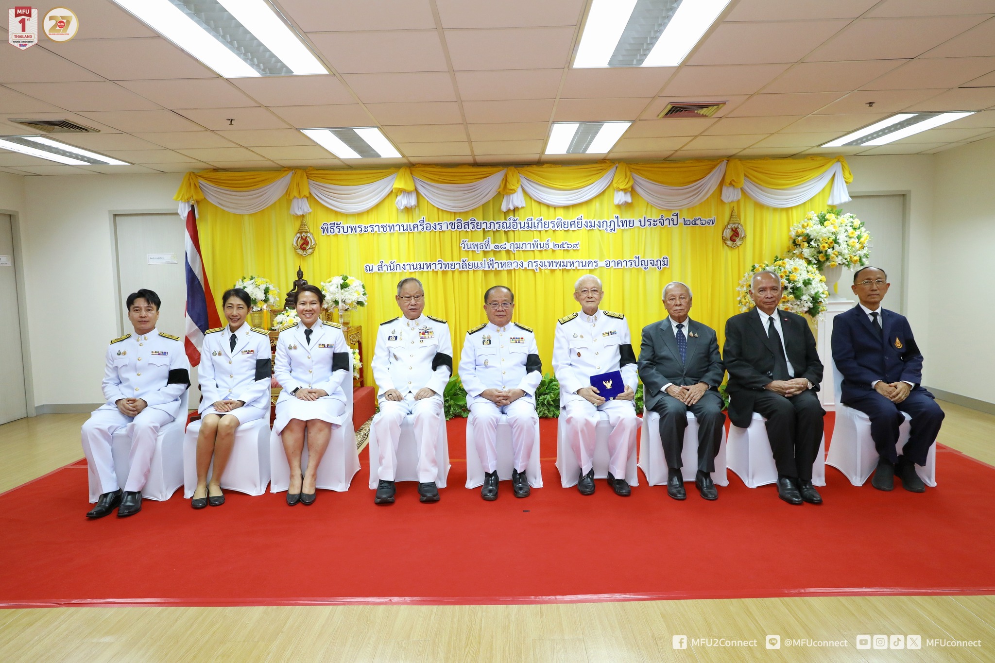 วันที่ 18 กุมภาพันธ์ 2569 มหาวิทยาลัยแม่ฟ้าหลวง (มฟล.) จัดพิธีรับพระราชทานเครื่องราชอิสริยาภรณ์อันมีเกียรติยศยิ่งมงกุฎไทย ประจำปี 2567 เบื้องหน้าพระบรมฉายาลักษณ์พระบาทสมเด็จพระเจ้าอยู่หัว ณ สำนักงานมหาวิทยาลัยแม่ฟ้าหลวง กรุงเทพมหานคร อาคารปัญจภูมิ