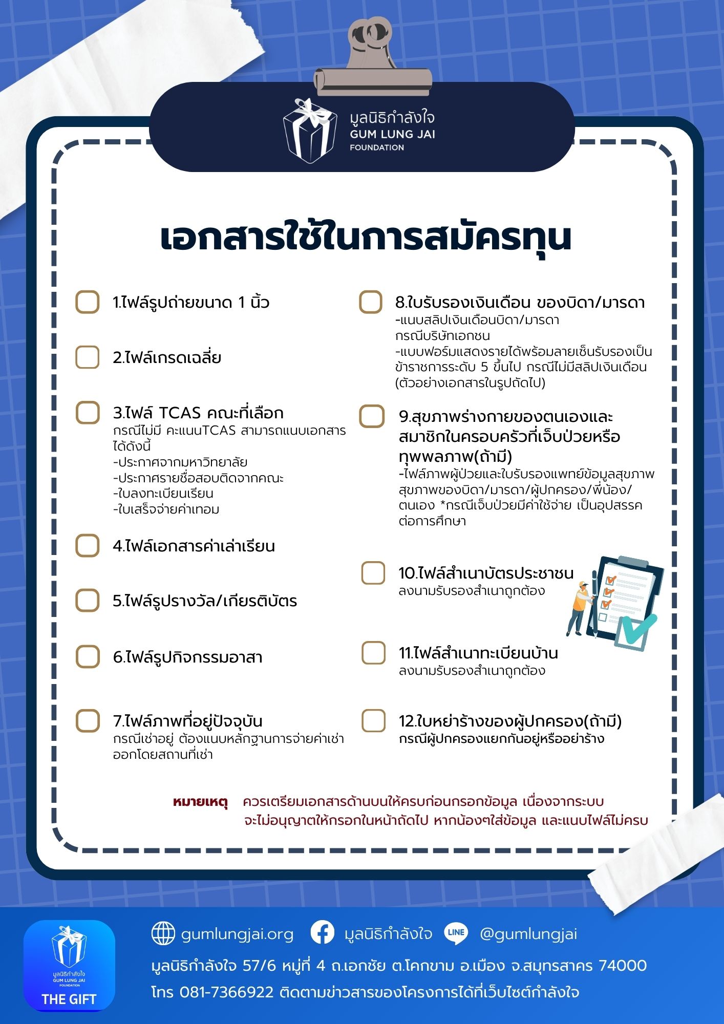 โปรดเตรียมเอกสารให้ครบถ้วนก่อนกรอกข้อมูล เนื่องจากระบบจะไม่รับการแก้ข้อมูลหากกรอกหน้าแรกเสร็จแล้ว (หากน้องๆ ใส่ข้อมูลและแนบไฟล์ไม่ครบ)