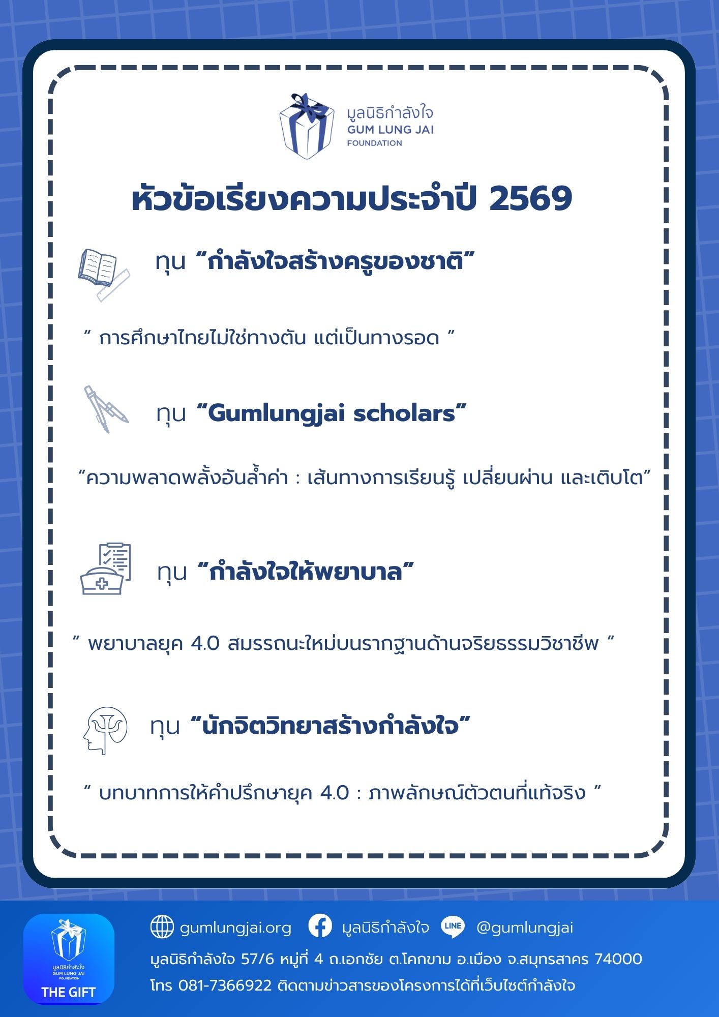 3. นักจิตวิทยาสร้างกำลังใจ: 40,000 บาท/ปี (5 ทุน)