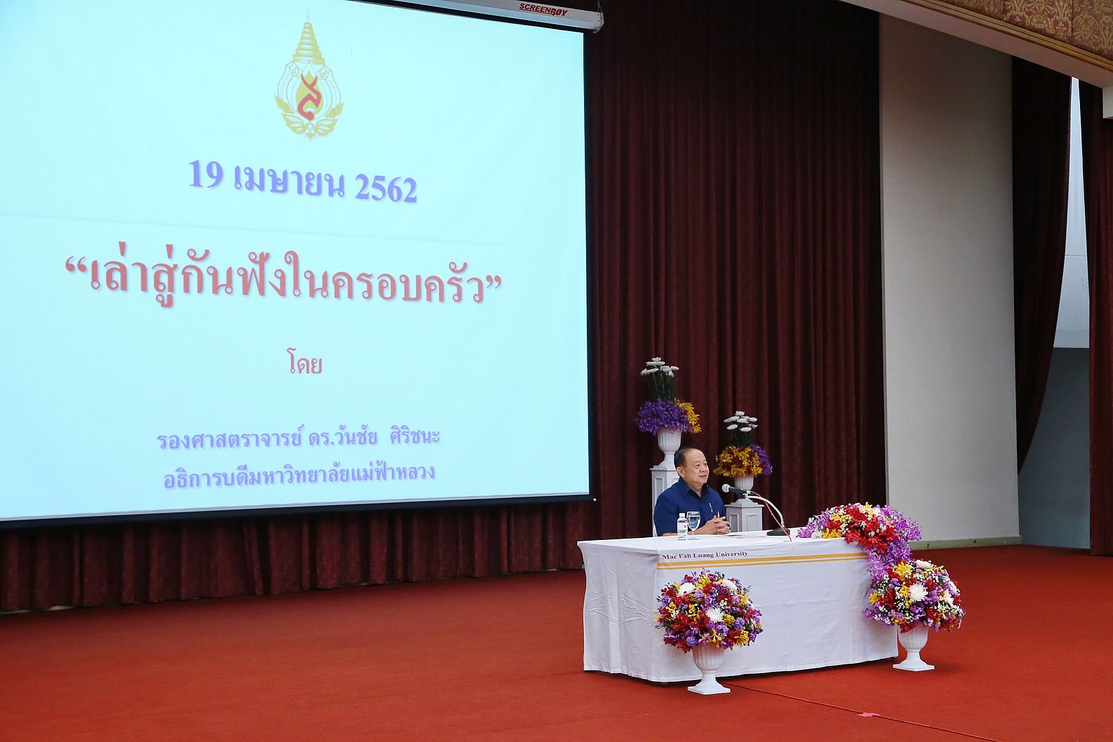 เมื่อวันศุกร์ที่ 19 เมษายน 2562 ชาวพนักงาน มฟล. รวมใจจัดกิจกรรม “งานวันชัย” ให้แก่ รศ.ดร.วันชัย ศิริชนะ อธิการบดี มหาวิทยาลัยแม่ฟ้าหลวง (มฟล.) ในฐานะที่เป็นอธิการบดีผู้ก่อตั้ง และจะหมดวาระการดำรงตำแหน่งในวันที่ 28 เมษายน 2562 ที่จะถึงนี้ โดยกิจกรรมช่วงแรกเริ่มต้นในเวลา 16.00 น. ณ หอประชุมสมเด็จย่า รศ.ดร.ชยาพร วัฒนศิริ รองอธิการบดี เป็นตัวแทนชาว มฟล. ขึ้นกล่าวแสดงความรักและความขอบคุณแด่อธิการบดีผู้ก่อตั้ง พร้อมอ่านบทกลอนแทนใจครอบครัว มฟล. จากนั้นเป็นการกล่าวแสดงความในใจจากตัวแทนนักศึกษา ตัวแทนศิษย์เก่า ตัวแทนพนักงานสายสนับสนุน ตัวแทนคณาจารย์ ต่อมาทุกคนรับชมวีดิทัศน์ อธิการบดีของเรา ที่ถ่ายทอดเรื่องราวของอธิการบดีผู้ก่อตั้งจากอดีตจวบจนปัจจุบัน ปิดท้ายด้วย รศ.ดร.วันชัย ศิริชนะ ขึ้นเวทีพบกับครอบครัว มฟล. เพื่อบอกเล่าเรื่องราวความผูกพันตลอดระยะเวลามากกว่า 20 ปี ที่มีต่อมหาวิทยาลัย พนักงาน และนักศึกษา รวมถึงบอกเล่าถึงความเป็นมาในการก่อตั้งมหาวิทยาลัยแม่ฟ้าหลวง พร้อมกล่าวย้ำว่า “อำลาโดยตำแหน่งแต่ความผูกพันยังคงอยู่” และหวังให้ชาวมหาวิทยาลัยสืบสานแนวพระราชปณิธานของสมเด็จพระศรีนครินทราบรมราชชนนีสืบไป หลังจากกล่าวจบ ชาวพนักงานและนักศึกษาร่วมใจมอบดอกกุหลาบให้แก่ รศ.ดร.วันชัย เพื่อแสดงความขอบคุณและความผูกพันที่มีต่ออธิการบดีของเรา