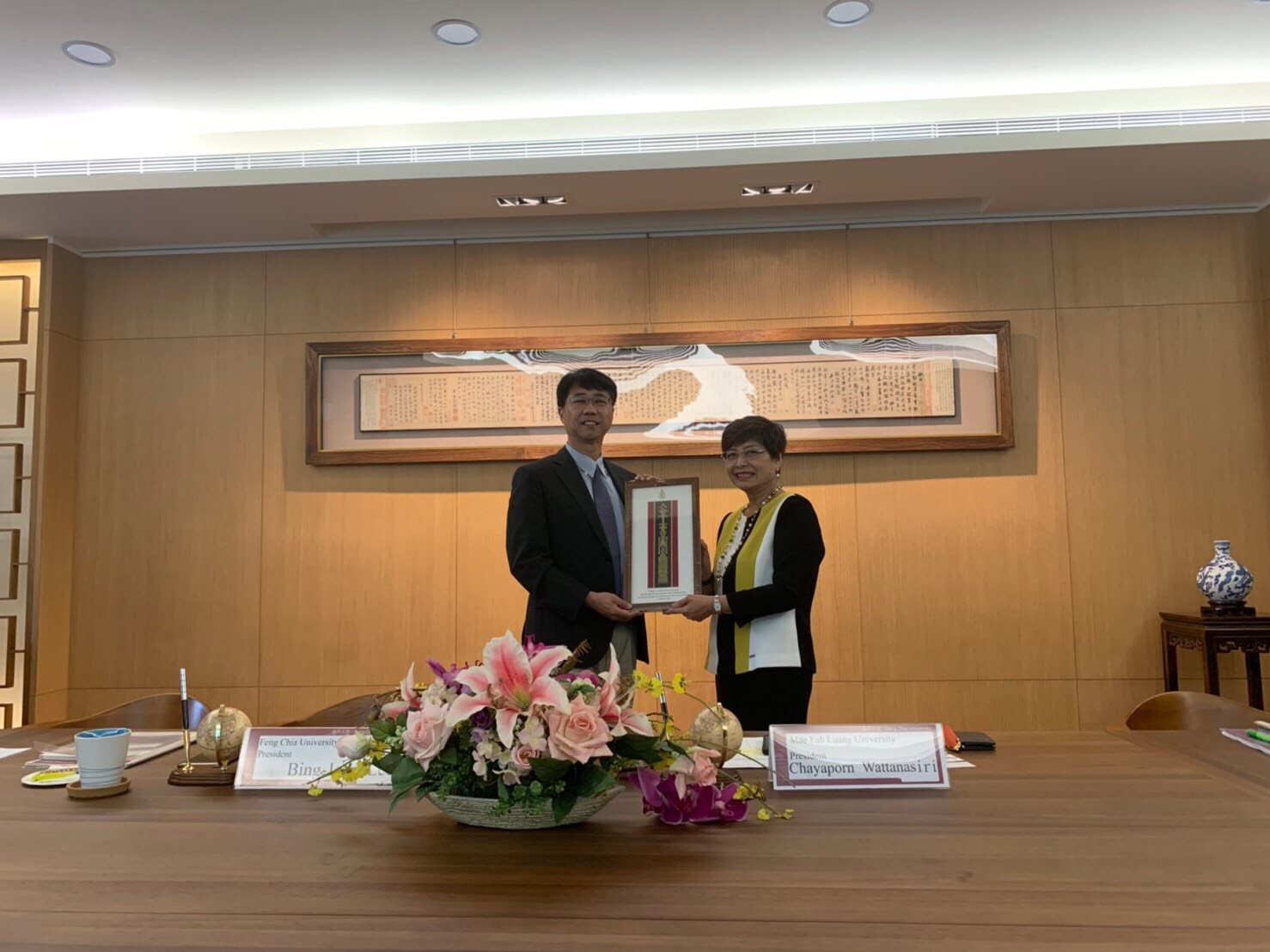 เมื่อเร็วๆ นี้ รศ. ดร. ชยาพร วัฒนศิริ อธิการบดีมหาวิทยาลัยแม่ฟ้าหลวง (มฟล.) นำคณะผู้บริหาร รศ. ดร. นันทนา คชเสนี รองอธิการบดี และ ดร. ฉัตรฤดี จงสุริยภาส ผู้ช่วยอธิการบดีและคณบดีสำนักวิชาการจัดการ ลงนามในบันทึกข้อตกลงความร่วมมือระหว่าง มฟล.กับมหาวิทยาลัยเฟิงเจีย สาธารณรัฐจีน (ไต้หวัน) ในระหว่างการเยือนสาธารณรัฐจีน (ไต้หวัน) เมื่อวันที่ 11 - 12 มิถุนายน 2562