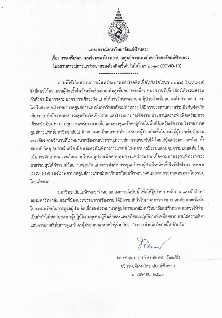 แถลงการณ์มหาวิทยาลัยแม่ฟ้าหลวง เรื่อง การเตรียมความพร้อมของโรงพยาบาลศูนย์การแพทย์มหาวิทยาลัยแม่ฟ้าหลวง ในสถานการณ์การแพร่ระบาดของโรคติดเชื้อไวรัสโคโรนา 2019