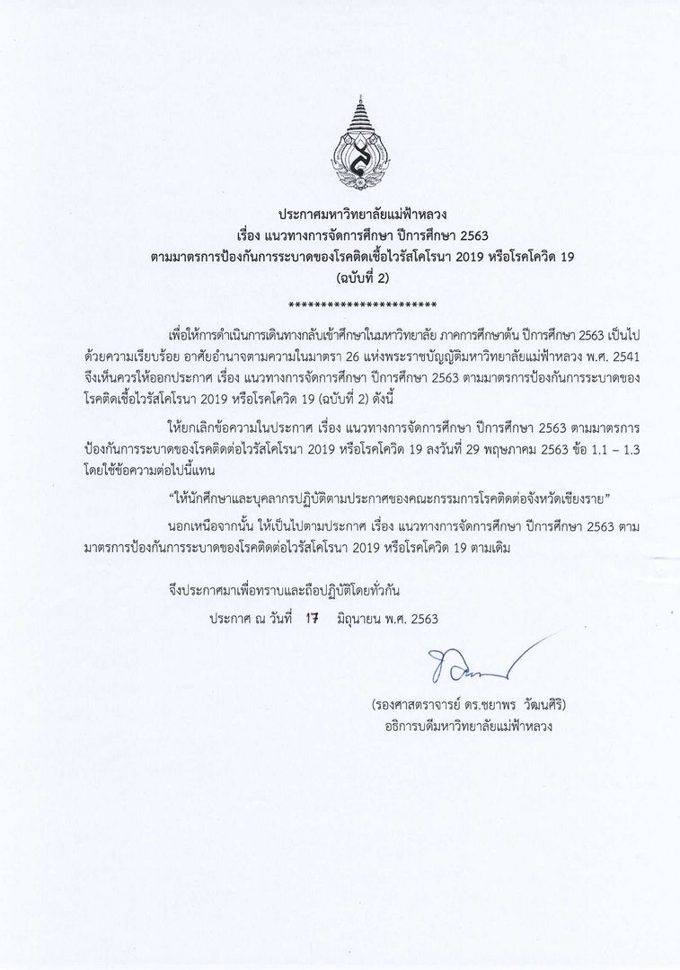 ประกาศมหาวิทยาลัยแม่ฟ้าหลวง เรื่อง แนวทางการจัดการศึกษา ปีการศึกษา 2563 (ฉบับที่ 2)