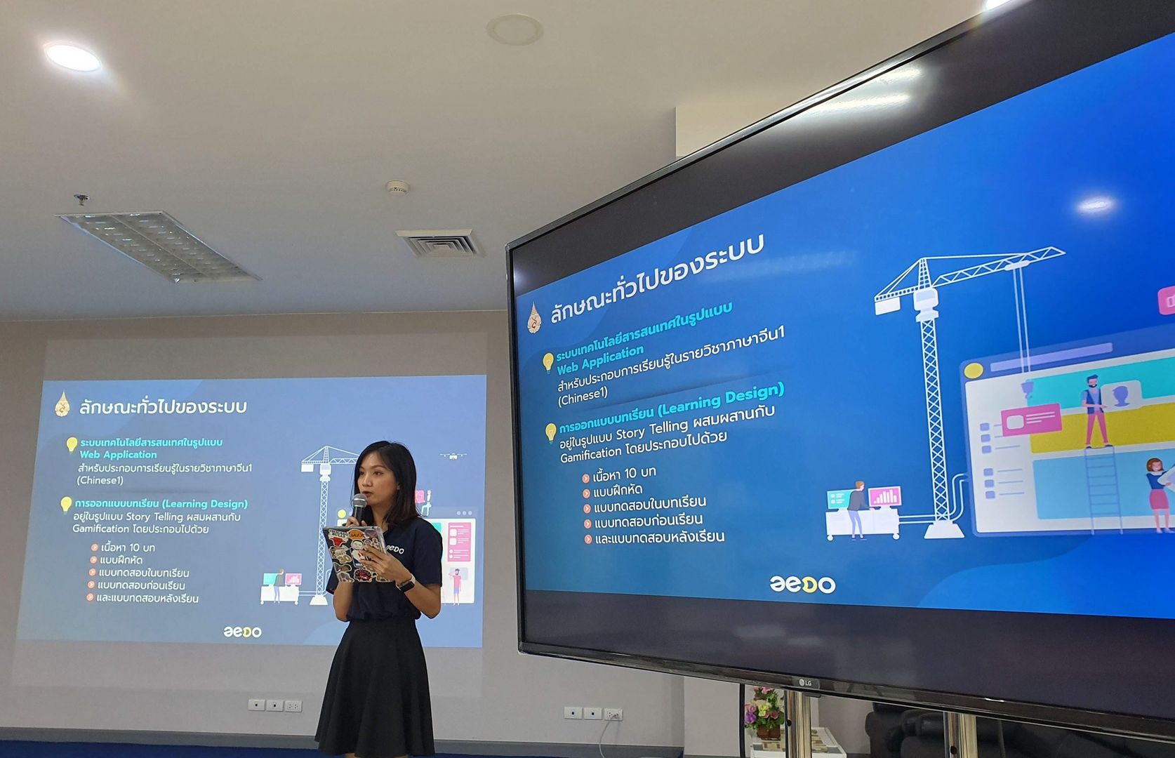 ต่อมา นางสาวไอรดา วางกลอน เจ้าหน้าที่จาก EADO ซึ่งเป็น Project Manager การพัฒนาระบบการเรียนรู้รายวิชาภาษาจีน 1 ได้นำเสนอภาพรวมของบทเรียนดิจิทัลนี้ให้แก่ผู้เข้าร่วมงานส่งมอบ ว่าลักษณะทั่วไปของระบบการพัฒนาระบบการเรียนรู้ดิจิทัลรายวิชา Chinese 1 ในรูปแบบของ Web Application มีการจัดเก็บข้อมูลบนระบบแม่ข่ายของมหาวิทยาลัย โดยตัวบทเรียนได้ออกแบบและเพิ่มความน่าสนใจโดยใช้การดำเนินเรื่องหรือว่า Story telling ผสมผสานไปกับ Game application เพื่อดึงดูดความสนใจของผู้เรียน รวมทั้งมีการใช้กราฟิก แอนิเมชัน และการเล่าเรื่องราวของตัวละคร ซึ่งในเนื้อหาประกอบไปด้วยบทเรียน 10 บท แบบฝึกหัด แบบทดสอบในบทเรียน แบบทดสอบก่อน และแบบทดสอบหลังบทเรียน”