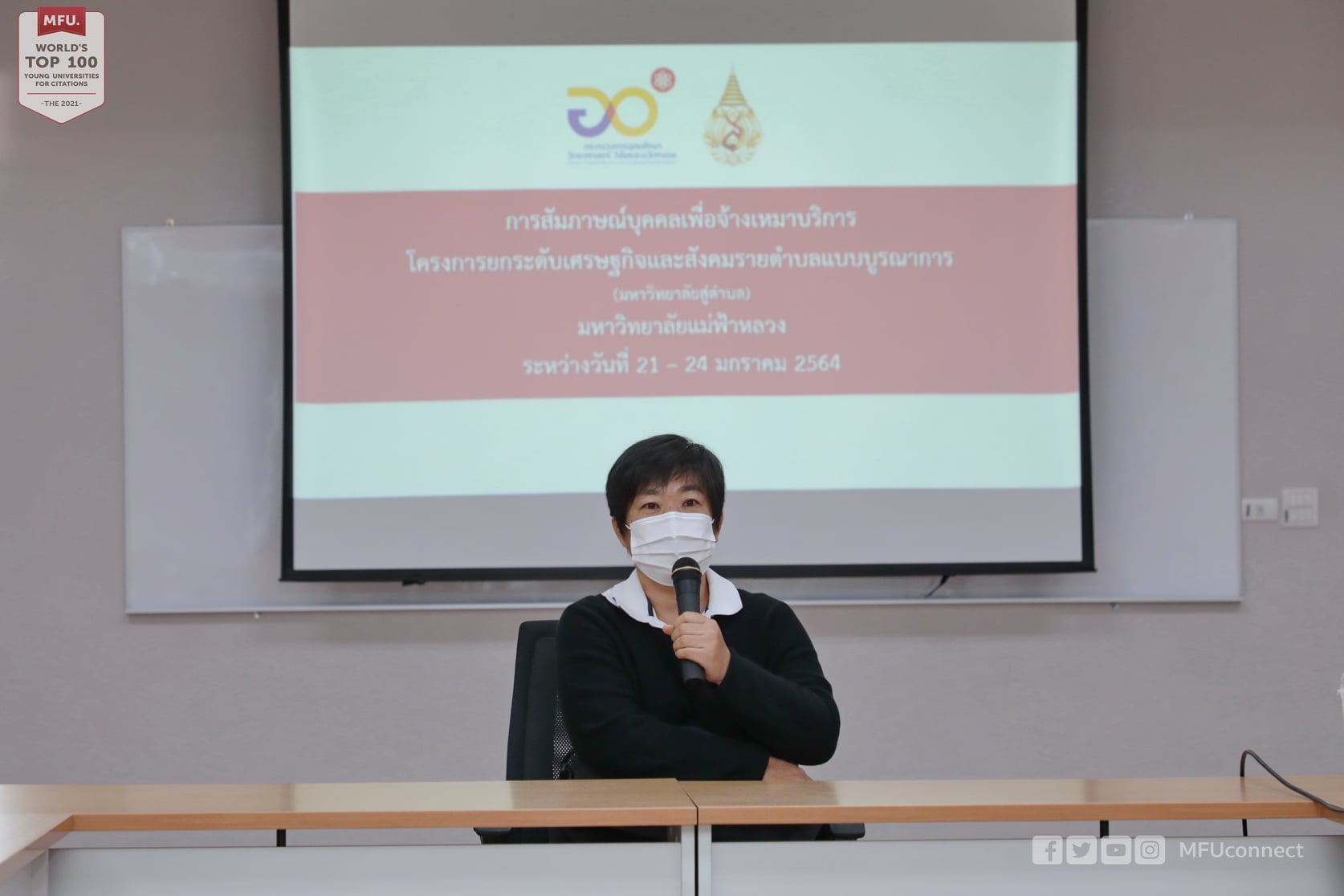 มหาวิทยาลัยแม่ฟ้าหลวง (มฟล.) โดย ศูนย์บริการวิชาการ จัดการสัมภาษณ์บุคคลเพื่อจ้างเหมาบริการโครงการยกระดับเศรษฐกิจและสังคมรายตำบลแบบบูรณาการ (มหาวิทยาลัยสู่ตำบล) ซึ่งได้รับงบประมาณสนับสนุนจากกระทรวงการอุดมศึกษา วิทยาศาสตร์ วิจัยและนวัตกรรม (อว.) ระหว่างวันที่ 21 - 24 มกราคม 2564 ณ อาคารพลเอกสำเภา ชูศรี (E4)