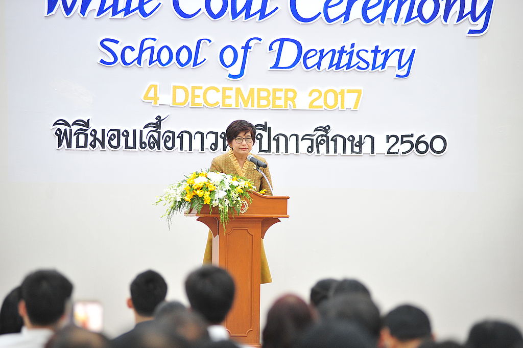 “หลักสูตรทันตแพทยศาสตร์ มฟล.ได้รับการรองหลักสูตรจากทันตแพทยสภาเมื่อวันที่ 15 พฤศจิกายน 2556 และรับนักศึกษารุ่นแรกในปีการศึกษา 2557 ถึงวันนี้จึงเป็นเวลาที่น่ายินดี ที่ลูกศิษย์รุ่นที่ 1 ของเรา กำลังย่างก้าวเข้าสู่ชีวิตการเรียนแพทย์ สาขาทันตแพทย์ ที่จะมีคนเรียกเขาว่า ‘คุณหมอ’ ในวิชาชีพของเราเสื้อกาวน์เป็นเครื่องแบบ ที่ทำหน้าที่มากกว่าการเป็นเสื้อคลุม เพราะยังได้เป็นสัญลักษณ์ทางใจถึงบทบาทหน้าที่ในสังคม ที่ต้องการความรับผิดชอบ จิตร วิญญาณและคุณธรรม มหาวิทยาลัยตระหนักถึงความสำคัญจึงได้จัดพิธีนี้ขึ้นเพื่อนักศึกษา”